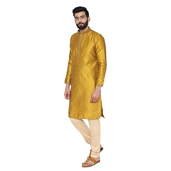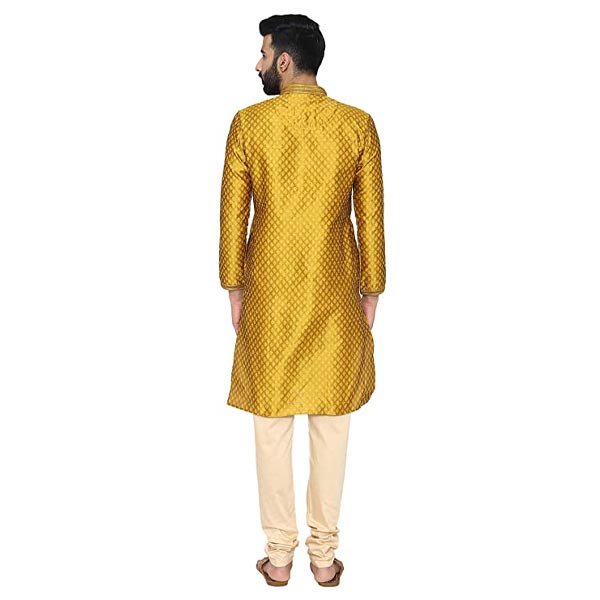 Men's Yellow Full Sleeve Regular Fit Designer Kurta & Churidar Set