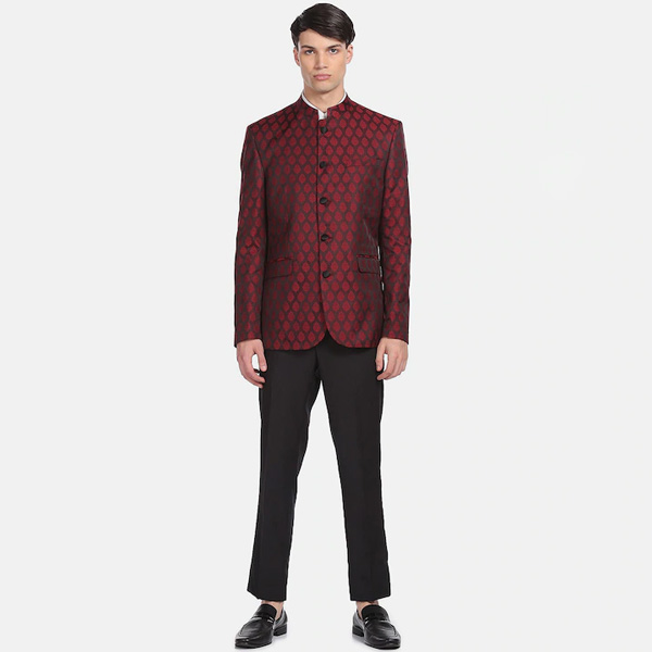 Maroon printed regular-fit bandhgala blazer, has a mandarin collar, long sleeves, button closure, a welt pocket at the chest, an attached lining, double-vented back hem