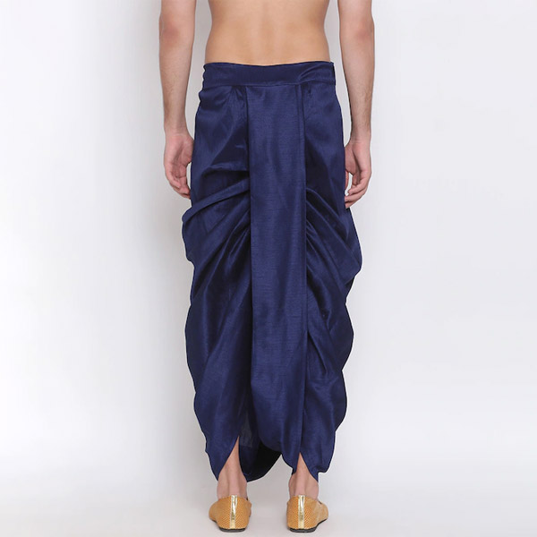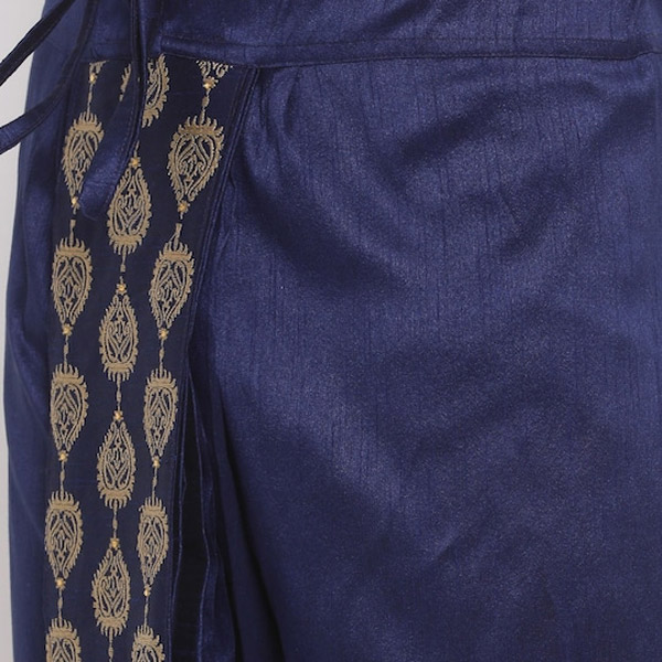 - Navy blue dhoti pants with intricate embroidery detailing, has an elasticated waistband with slip-on closure