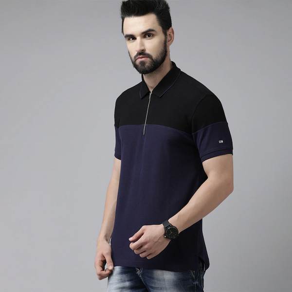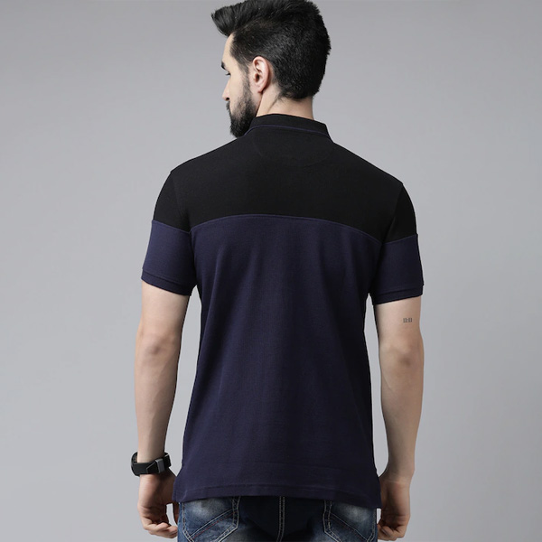 Men Navy Blue Striped Polo Collar Pure Cotton T-shirt